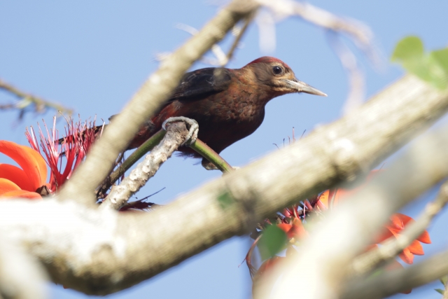 くっきりとした赤い頭と黒褐色の羽が特徴で、世界でも沖縄にしか生息しない極めて希少な鳥類です。