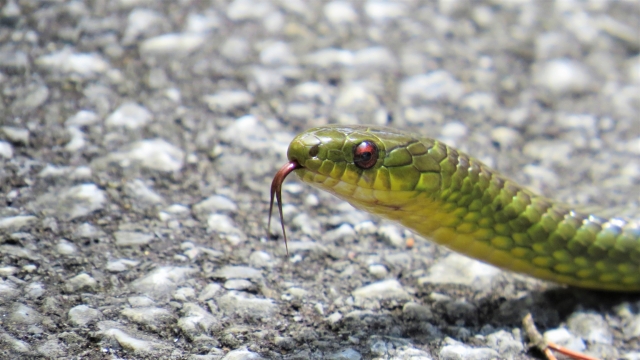 沖縄本島や西表島の森林などで見かけることがあるのが、「リュウキュウアオヘビ」。その名のとおり、体全体が美しい青緑色に輝く姿は、森の中で見かけると驚くほど美しい存在です。